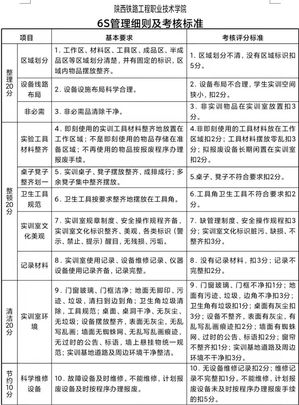 根據(jù)《陜西鐵路工程職業(yè)技術(shù)學(xué)院實訓(xùn)基地(室)6S管理實施辦法》,各部門對實訓(xùn)室(基地)出現(xiàn)的問題進(jìn)行梳理,積極探討,對實訓(xùn)室(基地)管理中的亮點,互相學(xué)習(xí),落實“整理、整頓、清潔、節(jié)約、安全、素養(yǎng)”的基本要求,通過檢查整改,達(dá)到“環(huán)境整潔、物品整齊、素養(yǎng)提高、形象一流”的良好效果。